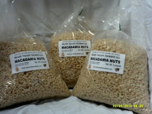 Three 5 pound bags of raw Macadamia nuts. Carefully selected nuts are what adorn our packaging, so we can give you the best tasting Macadamia Nuts possible.