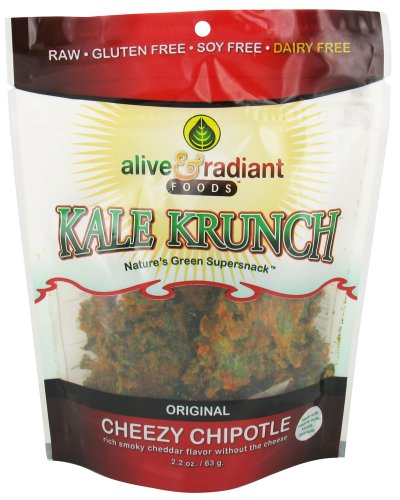 Alive & Radiant Foods - Kale Krunch Cheezy Chipotle - 2.2 oz (63 g) Alive & Radiant Foods Kale Krunch Cheezy Chipotle kicks things up a notch with chipotle peppers, smoked salt and paprika added to their signature "cheesy" blend of cashews, red bell pepper and nutritional yeast to create the perfect balance of southern smoke and heat. In each bag of Alive & Radiant Foods Kale Krunch Cheezy Chipotle you'll find full kale leaves that have been dehydrated for a satisfying crunch. Alive & Radiant Foods sprouts, mixes and dehydrates their ingredients at low temperatures so that they remain 'raw'. Since they never bake or fry, you can rest assured that the fat in their products comes from heart-healthy nuts and seeds. The nutrients and great taste stay intact and aren't processed away! Kale has been known to ease congestion, helps protect the stomach, and is a source of chlorophyll, calcium, iron and vitamins. Each bag is packed with nature's own superfoods and is fortified with everything to make it a complete meal. Alive & Radiant Foods is committed to reinventing the art of snacking, one leaf at a time. Raw Certified by CCOF; made with 90% organic fruits, nuts and vegetables Gluten-Free Soy Free Dairy Free Vegan Dehydrated, not baked of fried About Alive & Radiant Alive & Radiant was born to make truly healthy food radically delicious and fun. They take organic veggies, fruits and nuts, and craft them into snacks through a combination of wizardry and low-temperature dehydration. Every bag is a gift to your health. You're worth it. As the first company to ever bring a kale chip to market, Alive & Radiant innovates again by turning a new variety of healthy vegetables and seeds into delicious snacks with the launch of their new Veggie Krunch line.
