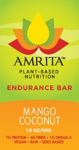 Amrita Endurance bars were designed by a vegan athlete looking for all natural sports nutrition. Unlike other whole food nutrition bars, Amrita includes a raw, plant-based protein source that gives the bars an added boost of amino acids, fiber and omega-3 fatty acids. Amrita, in Sanskrit, means "nectar of the gods." MANGO COCONUT: Tropical juicy mango, sweet coconut flakes, and tangy craisins.