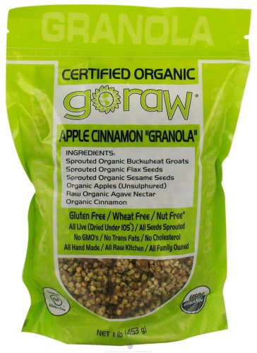 Freeland Foods Go Raw Certified Organic Apple Cinnamon Granola Freeland Foods Go Raw Certified Organic Apple Cinnamon Granola goes great with almond milk or eat it right out of the bag! Gently dried at less than 105 degrees, slightly sweet and loaded with fiber - it's gotta be the healthiest, most satisfying cereal ever! Gluten Free Wheat Free Nut Free Vegan Certified Organic All Live (Dried Under 105) All Seeds Sprouted No GMO's No Trans Fats No Cholesterol All Hand Made All Raw Kitchen All Family Owned Creating Real Live Food Is Freeland Foods' Passion Freeland Food Source the BestThe ver best organic seeds are selected, preferably from local growers. Freeland Food Sprout with CareThe seeds are optically sorted, soaked in filtered water, rinsed, then sprouted to perfection They Craft the FinestThe finest organic ingredients are mixed in, then hand spread on trays. the mix is loaded into custom-built dehydrators and slow dired at an average 98F to maximize enzymatic and nutritional integrity and flavor. They Pack with a PromiseThier products are packed and refrigerated exclusivelyin-house on dedicated equipment for uncompromised taste and freshness. Frequently Asked Questions What does "raw" mean?When food is labeled as raw, it means that none of the ingredients have been heated to a temperature above 118F in order to preserve all of the enzymes contained in the plant that would be destroyed by the extreme heat of cooking. Why eat raw food?Heat changes the molecular structure of food, and destroys most or all of the food's beneficial enzymes and renders its nutrients mostly unusable. Enzymes help the body to properly digest and assimilate food for optimal nutritional value. Although the body is capable of making enzymes it is believed to have a finite amount, and over time, the amount of available enzymes diminishes. Studies show that consuming living enzymes (i.e.