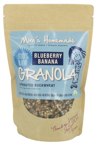 Mira's Homemade - 100% Raw Granola Blueberry Banana - 8 oz. (226g)The sweetness in Mira's Homemade 100% Raw Granola Blueberry Banana granola is derived primarily from dates making it mild yet satisfying. Children as well as adults appreciate the Blueberry-Banana granola, probably because we pack it with an abundance of fresh, organic bananas and sumptuous, ripe organic blueberries. So, what's not to love? Well, for starters, no refined sugar, no-GMOs, no gluten, no soy, no unnecessary additives, and no worries about what you or your children are eating! Their BLUEBERRY BANANA granola is lovingly homemade using purified water and the following four organic, raw ingredients: Sprouted buckwheat Dates Blueberries Bananas HEALTH BENEFITS of BLUEBERRIESIn the popular press, blueberries have reached superstar status in terms of their unique health benefits. While they prefer to think of all 130 World's Healthiest Foods as rightful superstars, they can understand many of the special accolades being given to this wonderful berry. Most health research on blueberries involves their phytonutrient content. Anthocyanins - the colorful antioxidant pigments that give many foods their wonderful shades of blue, purple, and red - are usually the first phytonutrients to be mentioned in descriptions of blueberries and their amazing health-supportive properties.: Whole Body Antioxidant SupportGiven the wide variety of antioxidant nutrients present in blueberries, it is not surprising to find research studies showing improved antioxidant defenses in body systems that need special protection from oxidation stress, like the cardiovascular system. But what is surprising about the blueberry research is its whole body relevance. It is not only the cardiovascular system that has been shown to have strengthened antioxidant status following consumption of blueberries.