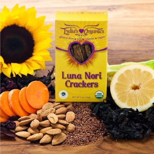 Lydia's Lovin Foods Luna Nori Crackers have a nutritious crunch with a vegetable nori flavor. This is Lydia's Best Seller! These crackers are made from vegetables, nuts, seeds, herbs, spices and sea vegetables and are grainless, gluten-free, sugar-free, oil-free and soy-free. Try these with your favorite spread like a hummus made from sprouted garbanzo beans. The nori and dulse sea vegetables provide necessary minerals beneficial to health.