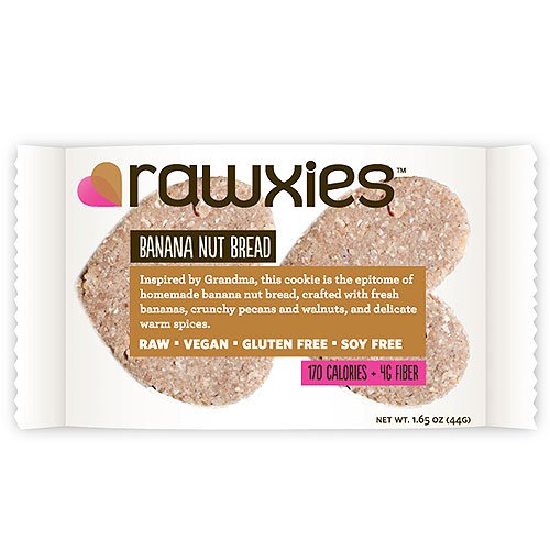 Rawxies Banana Nut Bread Cookies are the epitome of banana nut bread with fresh bananas, crunchy pecans and walnuts, and delicately warming spices. Raw, Gluten-free, Soy free and vegan, Rawxies cookies are made with Organic ingredients and Gluten-free oat flour.