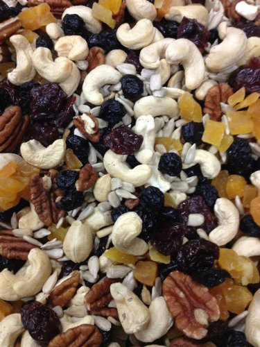 Raw pecans, blueberries, sunflower seeds, mango, cherries, cashews. 1 lb trail mix, packed in a PET plastic grocery type tub.